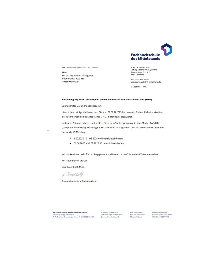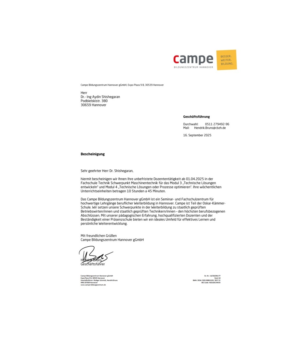 Dr. Dr.-Ing. Aydin Shishegaran ist bzw. war als Dozent an mehreren Hochschulen und Bildungsinstitutionen tätig, darunter die IU Internationale Hochschule GmbH, die Heinze Akademie GmbH, die Fachhochschule des Mittelstands GmbH sowie das Weiterbildungszentrum Campe.