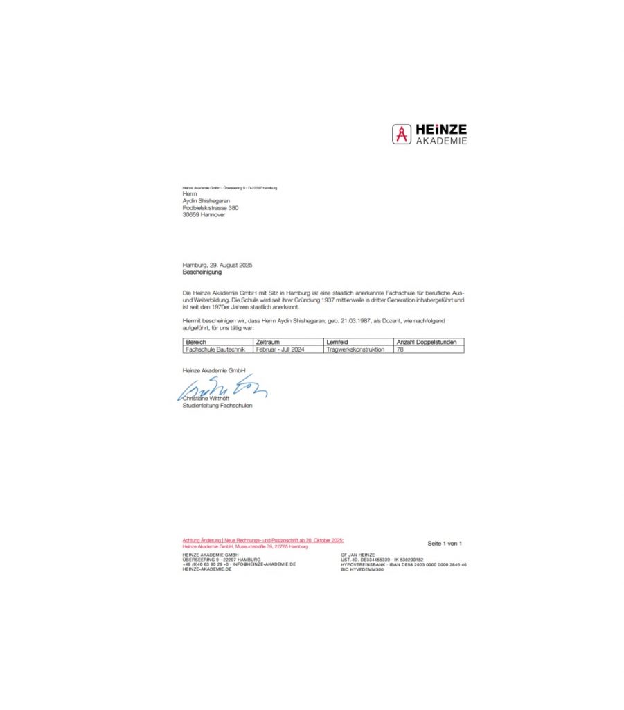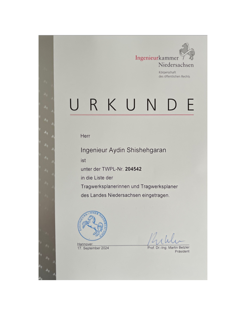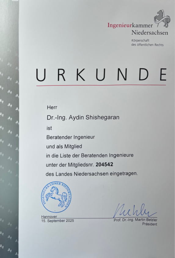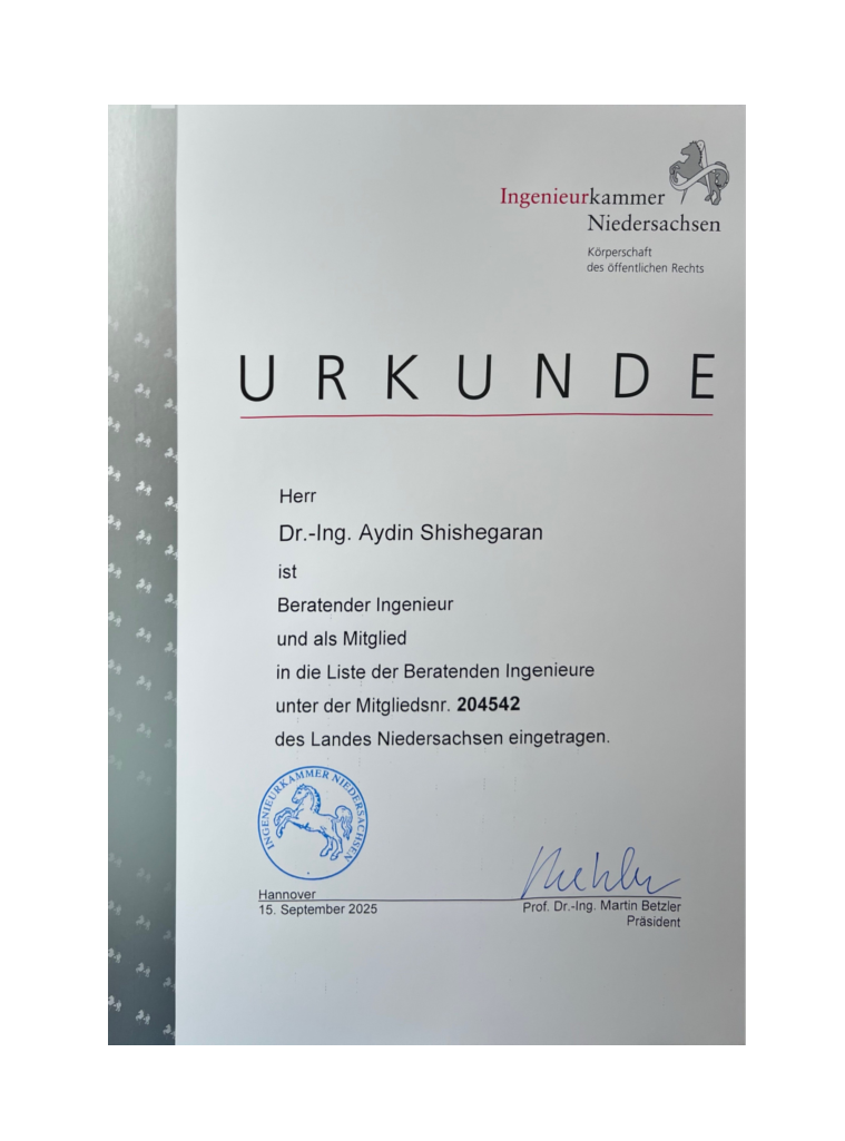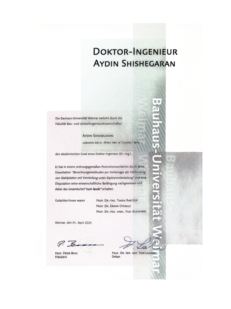 Dr. Dr.-Ing. Aydin Shishegaran ist ein zweifach promovierter Bauingenieur mit ausgewiesener Expertise in Bauplanung, Tragwerksplanung, Bauphysik, und Bauleitung. Er ist seit 2024 Geschäftsführer des Ingenieurbüros DIAS-Ingenieur, das sich auf Baustatik, Bauplanung und Bauleitung spezialisiert.